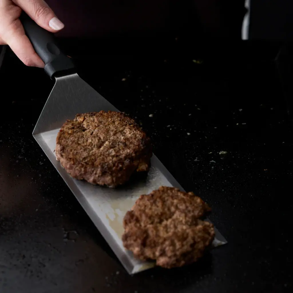 Offset handle design keeps hands safely away from hot surfaces and sharp edges while allowing for precision when lifting and flipping