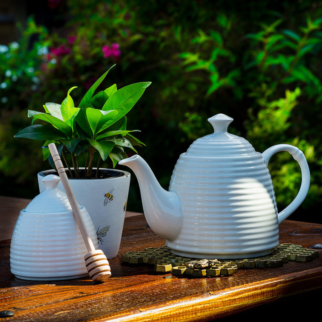 You will certainly bee impressed with our sweet hive shaped porcelain honey pot complete with wooden dauber.